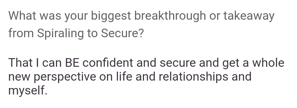 Spiraling to Secure is designed to give you the tools to regulate your nervous system, shift reactive patterns, and show up in love with more calm and confidence. Many students find that when they stop spiraling or shutting down, their relationships naturally improve as a result.